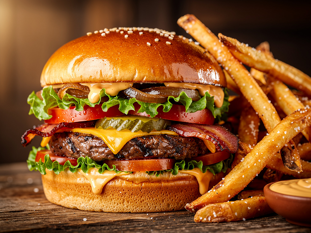 Steak haché bœuf, Cheddar affiné, Oignons caramélisés, Salade croquante, Tomate, Cornichon à la russe, Bacon grillé, Sauce maison moutarde douce